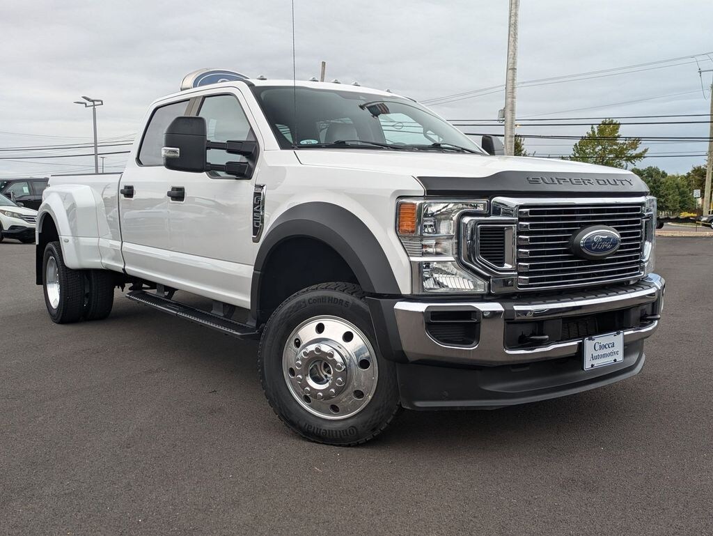 Located at Ciocca Ford of Quakertown, this clean CARFAX, local trade F-450 has been meticulously maintained and is ready for work or play. Outfitted with dual rear wheels, 19.5" forged polished aluminum wheels, and a GVWR of 14,000 lbs, its engineered for maximum stability and strength under load. The Limited Slip 4.30 axle ratio, STX Appearance Package, and Tough Bed spray-in bedliner combine rugged utility with sharp styling.