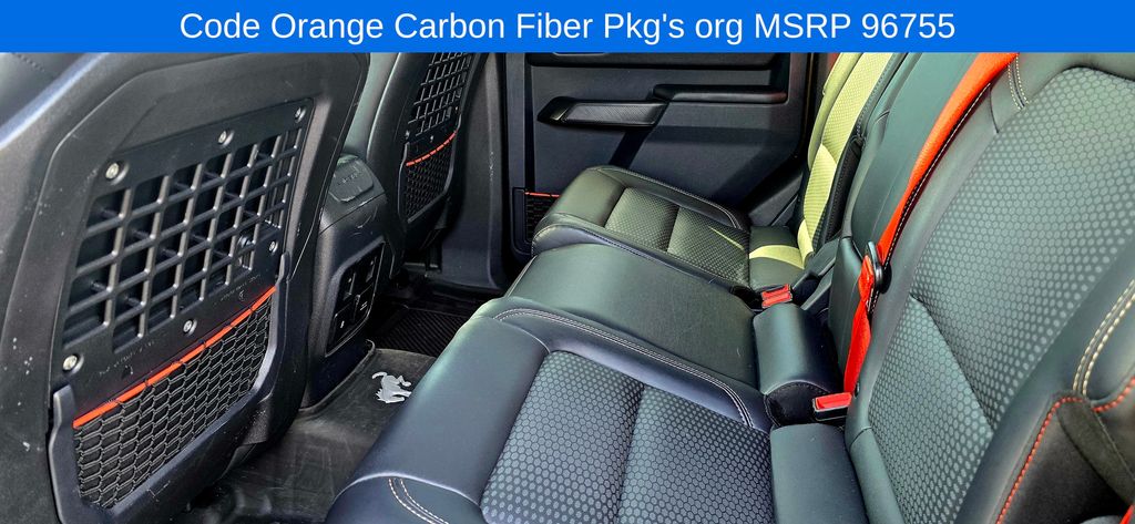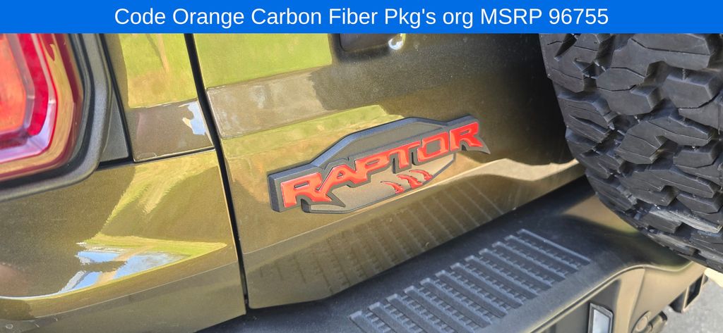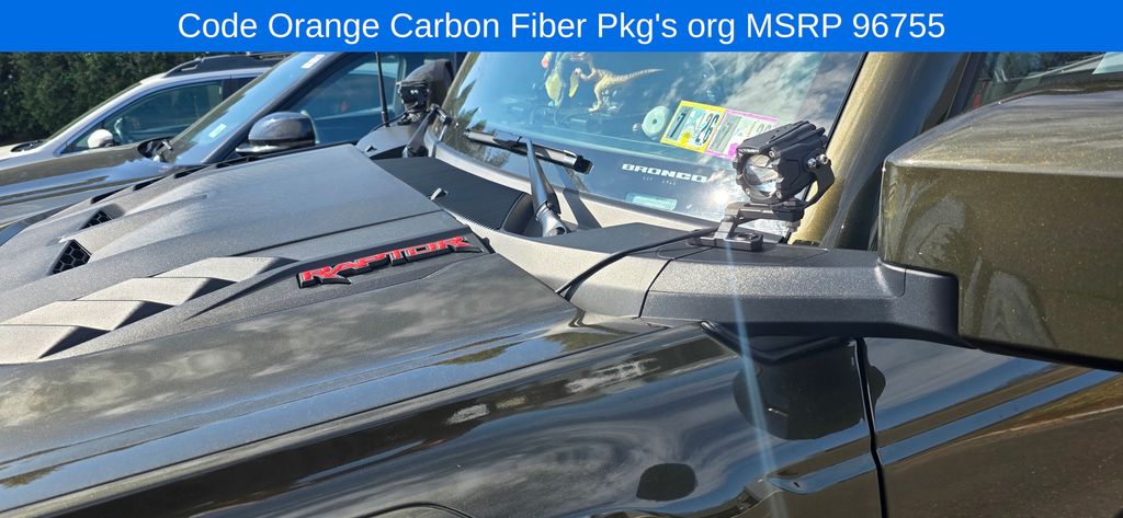 The Bronco Raptor's rugged good looks and premium features make it a true standout on the road. The Shelter Green Metallic exterior, complemented by the Code Orange Appearance Package, exudes a bold and confident presence. Step inside and you'll be surrounded by luxurious Marine Grade Vinyl Bucket Seats, an Interior Carbon Fiber Pack, and a premium B&O Sound System, creating an unparalleled driving experience.